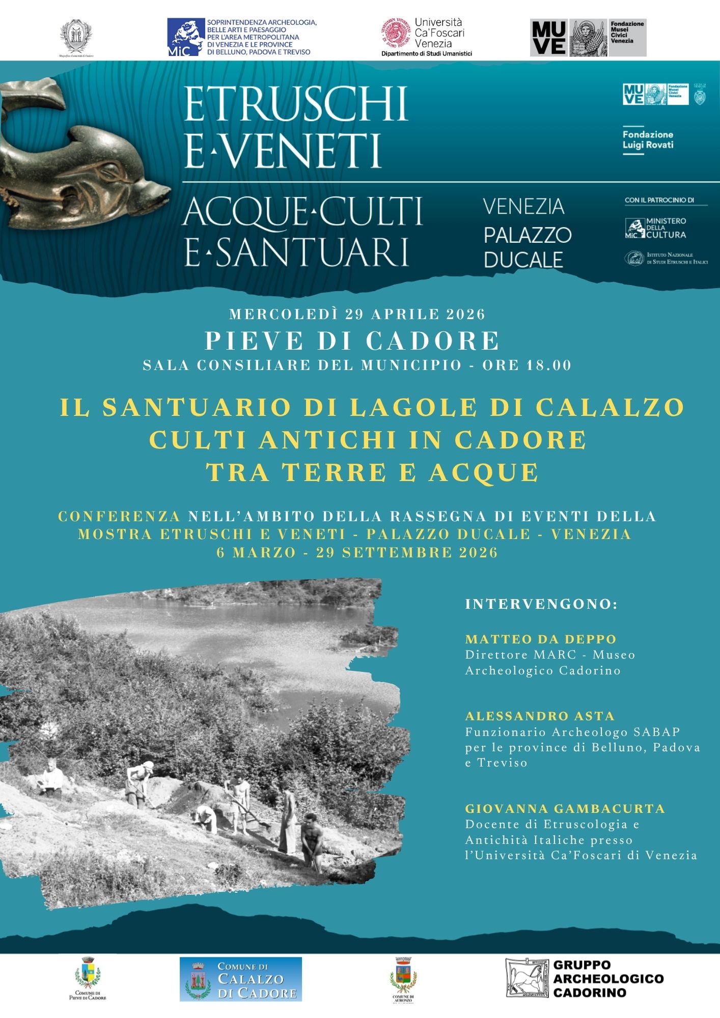 Mercoledì 29 aprile 2026, alle 18, nella sala Consiliare della sede comunale di Pieve di Cadore (Bl), la conferenza “Il santuario di Lagole di Calalzo. Culti antichi in Cadore tra terre e acque” con Matteo Da Deppo, direttore museo Archeologico Cadorino “E. De Lotto”; Alessandro Asta, funzionario archeologo soprintendenza Archeologia Belle arti e Paesaggio per le Province di Padova Treviso e Belluno; Giovanna Gambacurta, professoressa associata di Etruscologia e Archeologia italica, università Ca’ Foscari di Venezia; sesto appuntamento del ciclo di conferenze diffuso che da marzo a settembre 2026, in dialogo con la mostra “Etruschi e Veneti. Acque, culti e santuari” a Palazzo Ducale di Venezia fino al 29 settembre 2026, si terrà nei luoghi coinvolti dal progetto espositivo. ​Gli incontri accompagnano il pubblico lungo una geografia ampia e connessa, toccando Venezia e Adria, fino a Marzabotto, Milano, Ferrara e San Casciano dei Bagni: un’occasione per approfondire temi e contesti della mostra direttamente nei territori, tra musei e siti che ne condividono la trama di ricerche, prestiti e relazioni. La conferenza verterà sulla sezione dedicata ad Adria e Spina nella mostra “Etruschi e Veneti. Acque, culti e santuari” in corso a Venezia. Nel corso della conferenza verranno illustrati i temi cardine alla base della mostra, ci si concentrerà, inoltre, sulle ragioni che hanno portato ad esporre un consistente lotto di reperti provenienti dallo straordinario sito archeologico di Lagole di Calalzo, ampliando lo sguardo alle dinamiche del culto in età preromana, in Veneto, tra gli ambienti di montagna e di pianura. Si coglierà anche l’occasione per raccontare la nascita e la continua evoluzione dei percorsi espositivi del MARC – museo Archeologico Cadorino “Enrico De Lotto” e i progetti di studio e valorizzazione in corso. Incontro realizzato grazie al sostegno della soprintendenza ABAP per le Province di Belluno Padova e Treviso; Fondazione Musei Civici di Venezia; dipartimento di Studi umanistici dell’università Ca’ Foscari di Venezia; Comune di Pieve di Cadore; Magnifica Comunità di Cadore.