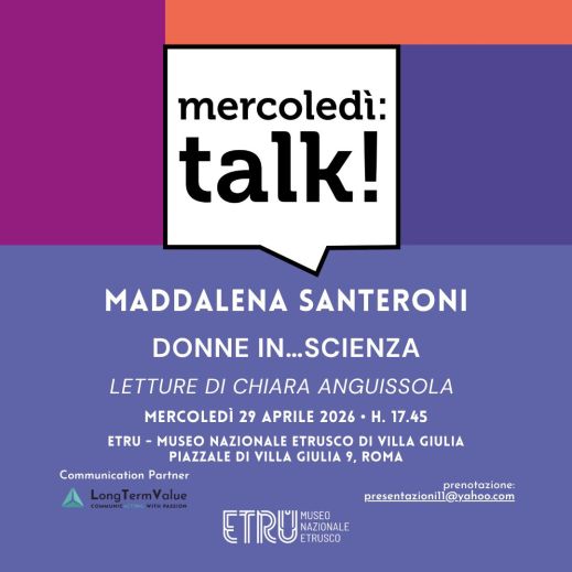 Al museo nazionale Etrusco di Villa Giulia torna l’appuntamento con MERCOLEDÌ TALK! il ciclo di incontri ideato dall’Associazione Amici dell’Arte moderna a Valle Giulia, che vede protagonisti grandi nomi della cultura e del pensiero italiano per svelare ciò che resta nascosto tra le pieghe della vita, della memoria, della cronaca. Mercoledì 29 aprile 2026, alle 17.45, appuntamento con Maddalena Santeroni su “Donne in… scienza”, che parlerà delle scienziate del XX secolo con letture di Chiara Anguissola. Ingresso gratuito in sala Fortuna fino ad esaurimento posti. Prenotazione obbligatoria all’indirizzo mail: presentazioni11@yahoo.com. L’incontro ripercorre le storie e i contributi di donne pioniere della scienza, come Marie Curie – prima persona a vincere due Premi Nobel, Rita Levi Montalcini, Lise Meitner, Rosalind Franklin e, ancora Emmy Noether – il cui teorema è oggi alla base della fisica moderna. Spazio anche a nomi meno noti al grande pubblico ma fondamentali per la ricerca, come Barbara McClintock, Katherine Johnson e Grace Hopper. La conferenza nasce per restituire visibilità a queste scienziate, spesso rimaste in ombra, e svelare curiosità, aneddoti e racconti di vita. “Raccontare le scienziate del XX secolo significa raccontare la scienza per intero” dichiara Maddalena Santeroni, curatrice dell’iniziativa. “Molte di loro hanno lavorato senza riconoscimenti, alcune hanno pagato con l’esclusione accademica. Oggi è il momento di ridare loro voce”.