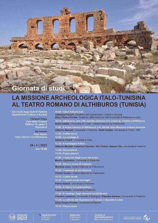 Martedì 29 aprile 2025, alle 10, nella Gipsoteca del dipartimento Culture e Società, Edificio 15 di viale delle Scienze, 8° piano, a Palermo, giornata di studio sulle attività della “Missione archeologica italo-tunisina al Teatro romano di Althiburos”. Sarà possibile seguire i lavori anche on line sulla piattaforma Teams al link: https://tinyurl.com/Althiburos.