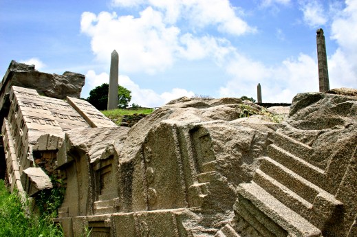 La città sacra di Axum. “Il 9 maggio lasciammo Adua per un’escursione ad Axum, situata a circa dodici miglia di distanza in direzione Ovest”, scrive Henry Salt in Voyage to Abyssinia and Travels into the Interior of that Country (1814). “A poche miglia da Axum si apre una vasta piana coltivata dove si raccolgono numerosi esemplari di pietre dure e agate. La città di Axum è collocata in una posizione molto gradevole in un angolo della piana, riparata dalle colline adiacenti. Avvicinandosi, il primo elemento che attira l’attenzione è una piccola stele ai piedi di una collina a mano destra, in cima alla quale sorge il monastero di Abba Pantaleon, e di fronte la grande lastra con l’iscrizione in greco che avevo precedentemente decifrato. Superati questi, la città e la sua chiesa cominciano ad apparire e, dopo aver virato un poco in direzione nord, lasciando una serie di piedistalli rotti (troni, ndt) sul lato sinistro, si apre una vista completa del grande obelisco, in piedi accanto a un immenso sicomoro. Quest’opera d’arte, finemente lavorata, ricavata da un unico blocco di granito che misurava sessanta piedi di altezza, produsse la stessa forte impressione nella mia mente come la prima volta in cui la vidi, e mi sentivo ancora più incline ad ammirare l’abilità e l’ingegnosità di chi aveva realizzato un’opera così stupenda. I suoi ornamenti a rilievo, insieme allo spazio cavo che corre verso l’alto e alla patera, conferiscono all’intera opera una leggerezza ed un’eleganza probabilmente senza rivali. Diversi altri obelischi giacciono rotti a terra, a poca distanza, uno dei quali di dimensioni ancora più grandi di quello or ora descritto”.