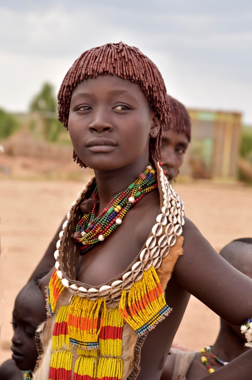 Gruppo etnico Hamer. Hamer è un gruppo etnico indigeno che vive nel sud dell’Etiopia, nel bacino della valle del fiume Omo. Il censimento del 2007 ha contato 46.532 individui di etnia Hamer. Sono pastori, ma praticano anche una agricoltura di sussistenza. Nella popolazione dei pastori Hamer, sia le donne che gli uomini sono molto “ambiziosi” e prestano molta cura al proprio corpo. Le donne Hamer, altere e bellissime, sono infaticabili. Impegnate nell’allevare i figli, nel preparare i pasti per la famiglia, nell’accudire all’abitazione. Ma tutto ciò non impedisce loro di dedicarsi anche alla cura della bellezza. Una caratteristica estetica, un segno inconfondibile delle donne Hamer, è l’elaborata pettinatura, sfoggiata con fierezza. La tipica acconciatura, chiamata “goscha”, è ottenuta dall’intreccio di sottilissime treccine spalmate di burro, ocra, polvere di ferro e argilla. Le donne indossano strette collane di ferro, gli “ensente”. Si tratta del dono di fidanzamento che la donna porterà per tutta la vita. Al momento del matrimonio, e se si tratta della prima moglie, la donna può portare un secondo collare di ferro, chiamato “bignere”, che presenta una protuberanza fallica e che viene aggiunto ai collari del fidanzamento. Gli uomini che abbiano ucciso un nemico oppure un animale feroce, pericoloso come un leone o un leopardo, si fregiano di una particolare acconciatura sul capo. Con l’argilla, che viene impastata direttamente sulla testa, formano una originale crocchia, una specie di caschetto che viene dipinto con ocra. Un piumaggio, preferibilmente di struzzo, completa l’acconciatura. È un segno di riconoscimento per il coraggio dimostrato. Come in molte altre culture, anche tra gli Hamer vige un complesso sistema di classi sociali. Un evento chiave della cultura di tutte le comunità che abitano nel cuore della valle dell’Omo, è il rito che celebra il passaggio di classe d’età dei giovani adolescenti. Uno dei riti più radicati e controversi della cultura Hamer è la cerimonia del “salto dei tori”, Uklì Bulà, rito che sancisce il passaggio dall’adolescenza all’età adulta. I giovani Hamer sono chiamati a dimostrare forza e coraggio saltando e correndo sui dorsi dei tori senza cadere, il che li farebbe risultare “sconfitti”. Superata la prova, i giovani diventano “adulti” e potranno sposarsi, possedere del bestiame ed avere dei figli. La cerimonia inizia con un “prologo” che agli occhi di noi occidentali può apparire arcaico e cruento. Le giovani Hamer, per mostrare che il loro coraggio è pari a quello degli uomini, si lasciano fustigare dai Maza, cioè da giovani che hanno già superato la prova del salto in anni precedenti, ma che sono ancora da sposare. Le giovani Hamer non subiscono questa che a noi appare una violenza. Anzi, per dimostrare la loro fierezza sfrontatamente affrontano i Maza per invitarli a colpirle. Questo atto violento lascerà sui corpi delle ragazze profonde cicatrici che verranno ostentate con orgoglio.