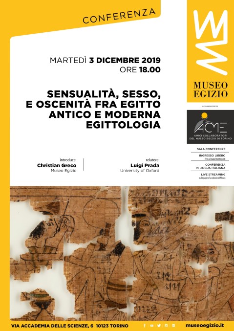 Sesso ed oscenità nell’antico Egitto sono argomenti poco conosciuti al pubblico anche a causa della storia della moderna Egittologia, e, in particolare, della censura applicata a testi ed artefatti antichi da generazioni di egittologi, sino ancora ad anni recenti. Questa conferenza intende presentare una storia alternativa dell’erotismo antico-egizio, dal periodo faraonico a quello greco-romano, illustrandola con esempi celebri e testimonianze meno note, se non ancora inedite, da un Egitto antico “a luci rosse”. Il Papiro satirico-erotico è tra i più famosi reperti del museo Egizio di Torino, scritto e illustrato da un pittore del villaggio di Deir el Medina all’epoca della XX dinastia. Il papiro si compone di due parti: la prima più satirica, con animali umanizzati; la seconda decisamente erotica, con una commistione di immagini e testo. Protagonista un uomo barbuto, con il corto gonnellino dei campagnoli, durante l’incontro con una cortigiana che viene descritto con dovizia di dettagli e un sorprendente senso dell’humor.