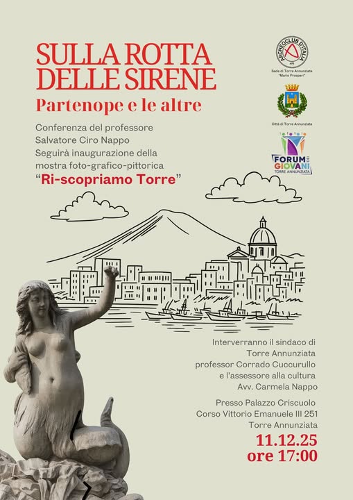 Giovedì 11 dicembre 2025, appuntamento alle 17 a Palazzo Criscuolo di Torre Annunziata (Na) per la conferenza “Sulla rotta delle sirene. Partenope e le altre” del prof. Salvatore Ciro Nappo, un viaggio tra mito, storia e identità culturale proposto da Archeoclub di Torre Annunziata “Mario Prosperi” e Forum dei giovani per coinvolgere la comunità in un processo di riscoperta e valorizzazione delle proprie radici. Dopo i saluti istituzionali del sindaco Corrado Cuccurullo e dell’assessore alla Cultura Carmela Nappo, la conferenza del professore Salvatore Ciro Nappo, dedicata al fascino millenario delle sirene e alla loro presenza nei racconti del Mediterraneo, con un’attenzione particolare al legame con la storia del territorio oplontino. Quindi sarà inaugurata la mostra foto-grafico-pittorica “Ri-scopriamo Torre”, un percorso visivo pensato per valorizzare scorci, monumenti e identità storiche della città, che si può visitare nei giorni di apertura del Comune.
