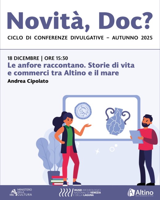 Giovedì 18 dicembre 2025, alle 15.30, al museo Archeologico nazionale di Altino (Ve), l’incontro “Le anfore raccontano. Storie di vita e commerci tra Altino e il mare” con Andrea Cipolato, dottore in Archeologia all’università Ca’ Foscari di Venezia, l’ultimo appuntamento dell’anno di “Novità, Doc?”, il ciclo di conferenze per scoprire le ultime novità sulla storia di Altino in compagnia di giovani ricercatori. Andrea Cipolato accoglierà le visitatrici e i visitatori per raccontare come migliaia di frammenti di anfore provenienti da Altino e dalla Laguna Nord di Venezia hanno permesso di ricostruire la vita economica, le dinamiche commerciali e le pratiche di riutilizzo ad Altino, importante nodo commerciale dell’Adriatico. L’evento è su prenotazione; è gratuito per gli abbonati e incluso nel biglietto d’ingresso per gli altri. Per informazioni e prenotazioni: info.parcoaltino@cultura.gov.it, 0422789443.