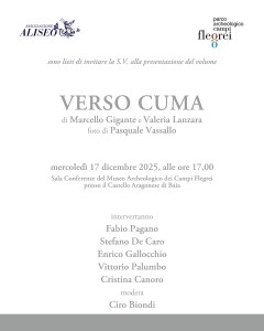 Mercoledì 17 dicembre 2025, alle 17, nella sala conferenze del museo Archeologico dei Campi Flegrei e Castello di Baia, a Bacoli (Na), presentazione del libro “Verso Cuma” di Marcello Gigante e Valeria Lanzara con le foto di Pasquale Vassallo (Edizione l’Aliseo). Interverranno Fabio Pagano (direttore del parco archeologico dei Campi Flegrei), Stefano De Caro (già soprintendente per i Beni archeologici di Napoli e Caserta e direttore generale per i Beni archeologici del ministero dei Beni culturali), Enrico Gallocchio (archeologo subacqueo e docente universitario), Cristina Canoro (socia co-fondatrice Centro Sub Campi Flegrei) e Vittorio Palumbo (editore e presidente dell’associazione Aliseo). Incontro moderato da Ciro Biondi, giornalista. Protagonisti della pubblicazione sono i poeti e gli storici che nel corso dei millenni hanno lasciato traccia nei Campi Flegrei. Si tratta di un’antologia interamente dedicata alla letteratura dell’antichità. Si parte da Virgilio – il cui segno è caratterizzato dagli inferi – ad autori come Catullo, Properzio, Ovidio, Orazio, Cicerone, Tacito e tanti altri. Il volume, in formato 32 per 32, è stampato su carta pregiata. Completano le foto che misurano 16 per 16 in carta patinata e incollate sulle pagine. La prima edizione di “Verso Cuma” fu pubblicata nel 1991 e conteneva le fotografie di Mimmo Jodice. In quella occasione l’Aliseo “adottò” l’archeologia marina dei Campi Flegrei. Con questa pubblicazione l’associazione Aliseo celebra i suoi primi quarant’anni di attività. Si tratta di un modo per raccontare l’archeologia sommersa e lo sforzo sostenuto per far conoscere l’importante patrimonio dei Campi Flegrei. Da qualche anno Aliseo ha una nuova sede in Cilento.