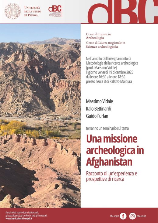 Nell’ambito dell’insegnamento di Metodologia della ricerca archeologica tenuto dal prof. Massimo Vidale (dipartimento dei Beni culturali, università di Padova) venerdì 19 dicembre 2025, dalle 16.30 alle 18.30, nell’aula B di Palazzo Maldura a Padova, Massimo Vidale e Guido Furlan, dipartimento dei Beni culturali dell’università di Padova, e Italo Bettinardi, libero professionista, terranno un seminario sul tema “Una missione archeologica in Afghanistan: racconto di un’esperienza e prospettive di ricerca”. Sono invitati a partecipare tutti gli interessati.