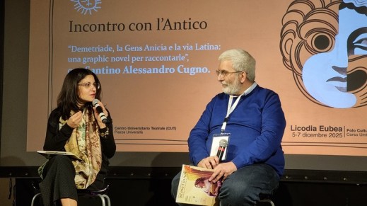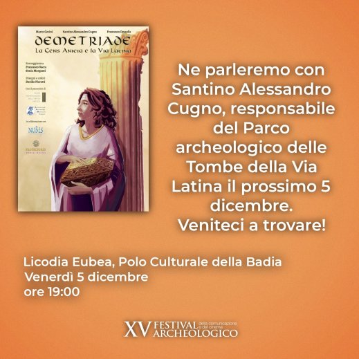 Per il primo “Incontro con l’Antico” del XV Festival della Comunicazione e del Cinema archeologico di Licodia Eubea (Ct) venerdì 5 dicembre 2025, al Polo culturale della Badia di Licodia Eubea, Santino Alessandro Cugno, archeologo del parco archeologico dell’Appia Antica e responsabile del parco archeologico delle Tombe di Via Latina, in dialogo con Alessandra Cilio, co-direttrice artistica del Festival, ha presentato la graphic novel “Demetriade. La Gens Anicia e la via Latina” che lui ha ideato, edita da Nubes, realizzata degli sceneggiatori Sergio Vacca e Sonia Morganti con i disegni e i colori di Davide Pierotti. Il fumetto racconta le vicissitudini di una nobildonna romana della prima metà del V secolo d.C., convertita al Cristianesimo, e dell’origine della basilica di Santo Stefano protomartire al III miglio della via Latina, voluta proprio da Demetriade. La storia di Demetriade è quella di una fanciulla della nobile famiglia degli Anici che – guidata dal suo profondo amore per Cristo – attraversò un’epoca tempestosa e complessa, si confrontò con Sant’Agostino e San Girolamo e commissionò la costruzione della basilica di Santo Stefano nella sua proprietà sulla Via Latina. I resti dell’edificio furono ritrovati nel 1857 e sono ancora oggi oggetto di scavi e studi. “archeologiavocidalpassato.com” ha incontrato l’archeologo Santino Alessandro Cugno per parlare del fumetto, della rievocazione storica, e della sua pubblicazione gratuita online.