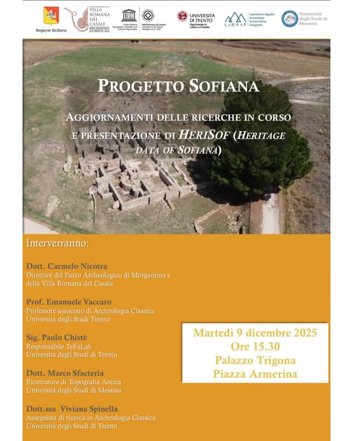 Martedì 9 dicembre 2025, alle 15.30, a Palazzo Trigona a Piazza Armerina (En), la conferenza “Progetto Sofiana. Aggiornamenti delle ricerche in corso e presentazione di HeriSof (Heritage data of Sofiana)”, un appuntamento pensato per condividere gli sviluppi delle ricerche in corso e presentare HeriSof, il nuovo progetto dedicato alla valorizzazione e alla rilettura dei materiali provenienti dagli scavi condotti tra il 1951 e il 2001. Durante l’incontro sarà inoltre anticipata la prossima uscita del libro dedicato al Progetto Sofiana, a cura del prof. Emanuele Vaccaro. Intervengono: Carmelo Nicotra, direttore del parco archeologico di Morgantina e della Villa Romana del Casale; Emanuele Vaccaro, direttore scientifico del progetto Sofiana, professore associato di Archeologia classica dell’università di Trento; Paolo Chistè, responsabile TeFaLab dell’università di Trento; Marco Sfacteria, coordinatore sul campo a Sofiana, ricercatore di Topografia antica all’università di Messina; Viviana Spinella, coordinatore sul campo a Sofiana, assegnista di ricerca in Archeologia classica all’università di Trento.