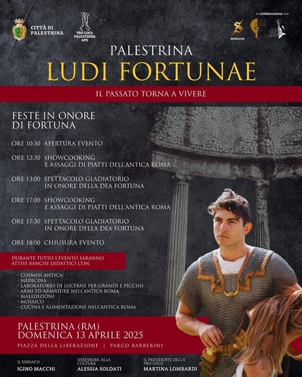 Domenica 13 aprile 2025 Palestrina (Roma) si trasforma in un autentico scenario dell’epoca romana, con la rievocazione storica dei Ludi Fortunae in onore della Dea Fortuna Primigenia. Appuntamento dalle 10.30 in piazza della Liberazione – Parco Barberini di Palestrina per un viaggio unico tra battaglie, rituali, giochi e sapori di un tempo lontano. Un’occasione unica per vivere la storia, tra spettacolo, cultura e divertimento. Ingresso libero. In programma spettacoli gladiatori alle 13 e alle 17.30: duelli mozzafiato in onore della Dea, con combattimenti storicamente accurati. Showcooking e degustazioni alle 12.30 e alle 17: un’archeocuoca guiderà alla scoperta dei sapori dell’antica Roma con dimostrazioni e assaggi esclusivi. Rievocazione di un accampamento militare: si potrà esplorare un vero castrum romano e scoprire le tecniche di guerra e la vita quotidiana dei legionari. Tavoli didattici e laboratori interattivi per grandi e piccoli. Sorti e rituali antichi: scoprire il destino nelle tavolette oracolari. Mosaico e decorazioni romane: creare un capolavoro ispirato agli antichi artisti. Armi e armature: toccare con mano l’equipaggiamento dei guerrieri romani. Cosmesi e medicina nell’antichità: scoprire i segreti della bellezza e della cura del corpo.