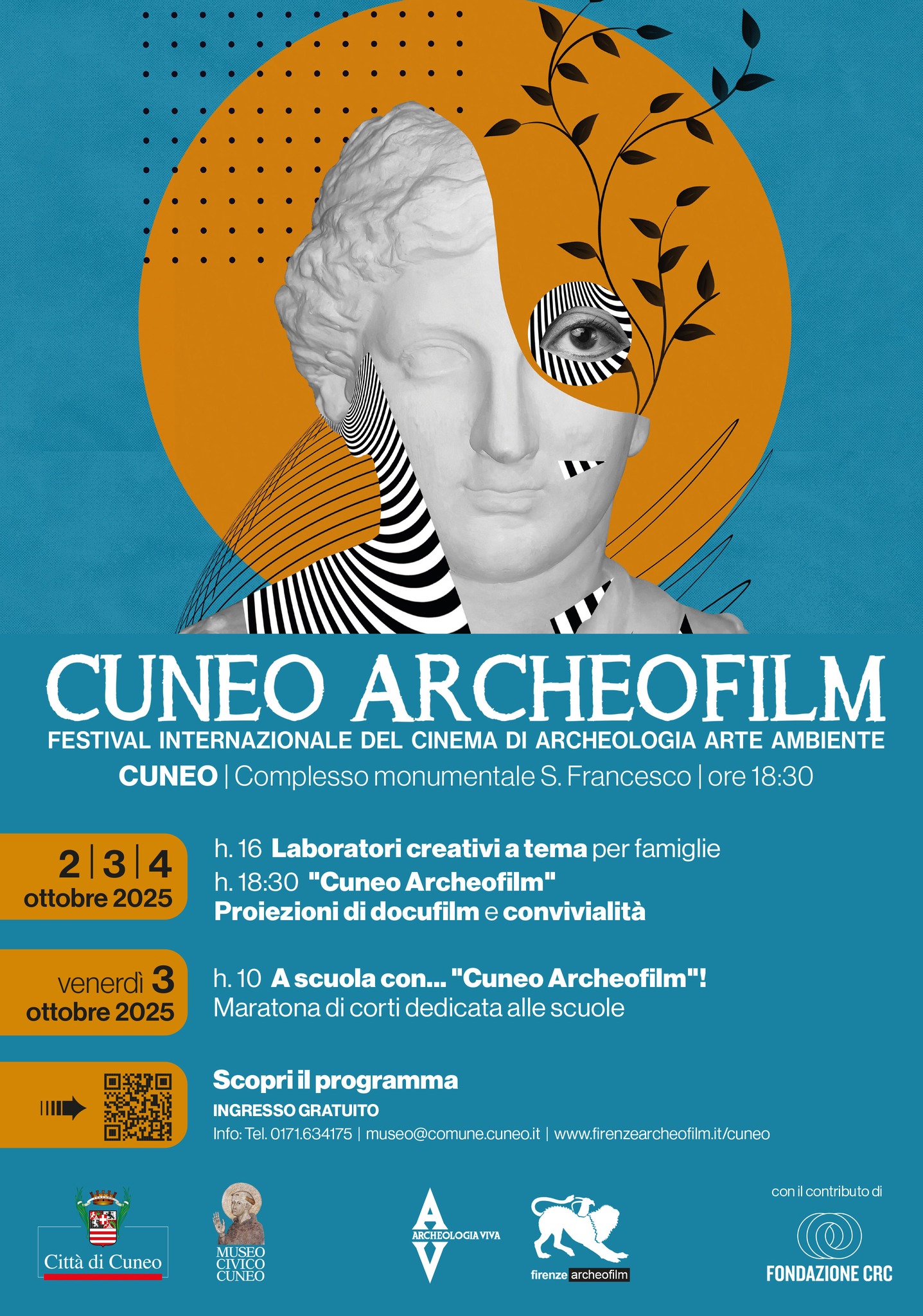 Giovedì 2 ottobre 2025, alle 18.30, al Complesso Monumentale di San Francesco in via Santa Maria 10, a Cuneo, prende il via la terza edizione del “Cuneo Archeofilm”. Con la nuova formula dell’orario preserale, il Festival internazionale del Cinema di Archeologia Arte Ambiente quest’anno offre agli spettatori un aperitivo conviviale nel chiostro del Complesso durante l’intervallo tra le proiezioni. Due i film in programma giovedì 2 ottobre e tre quelli di venerdì 3 ottobre, mentre sabato 4, dopo la proiezione dell’ultimo docufilm in concorso vengono assegnati i premi “Cuneo Archeofilm” al film più votato dal pubblico e “Cuneo Archeofilm – Scuole” al più apprezzato dai ragazzi. La serata finale si chiude con la proiezione di un film fuori concorso e del cortometraggio premiato dagli studenti. La mattinata di venerdì 3 ottobre 2025 è dedicata alle scuole secondarie di I e II grado, con la proiezione di documentari realizzati ad hoc per i ragazzi di quell’età. Nei pomeriggi di giovedì, venerdì e sabato, dalle 16 alle 18, il museo civico di Cuneo propone alle famiglie con bambini tra i 3 e gli 8 anni attività laboratoriali gratuite a tema archeologico. L’ingresso a tutti gli appuntamenti è gratuito. Il Festival internazionale del Cinema di Archeologia Arte Ambiente è organizzato dal museo civico e dal Comune di Cuneo, in collaborazione con Firenze Archeofilm, Archeologia Viva (Giunti Editore) e soprintendenza Archeologia Belle arti e Paesaggio per le province di Alessandria Asti e Cuneo e con il sostegno di Fondazione CRC.
