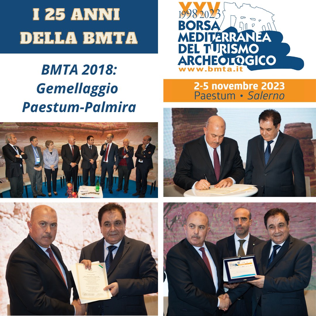 Il rilancio della Siria parte da Paestum: i due ministri della Cultura e del Turismo presenti alla XXVII BMTA. Dal 2015, a seguito della distruzione del sito archeologico di Palmira, la BMTA ha lanciato l’International Archaeological Discovery Award. La Siria è stata espositore per la prima volta nel 2002 e Paese Ospite nel 2003; a Damasco, nel 2005, il fondatore, Ugo Picarelli, consegnò il “Premio “Paestum” alla First Lady Asma al-Assad. Poi, nei periodi più difficili, dal 2011 al 2024, il dialogo fra Paestum e Palmira è stato sempre costante, grazie a Mohamad Saleh, ultimo direttore per il turismo del sito siriano, sempre presente nello spazio dedicato alla “sposa del deserto”, che la BMTA ha predisposto annualmente nel salone espositivo. Le due aree archeologiche hanno molto in comune, a partire dall’Unesco, che le ha certificate patrimonio dell’umanità, Paestum nel 1998 e Palmira nel 1980, che fu anch’essa parte dell’Impero Romano, fino alla conquista araba del 634 d.C. A seguito della distruzione di Palmira del 2015, iniziata nel 2013 a causa della guerra civile, la BMTA nella XIX edizione del 2016 oltre a inserire nell’immagine coordinata la foto dell’area archeologica con l’hashtag “#Unite4HeritageforPalmyra”, che accompagnava l’appello internazionale del direttore generale Unesco Irina Bokova, si fece promotore dell’accordo di amicizia e gemellaggio firmato il 16 novembre 2018 in occasione della XXI edizione dal sindaco di Paestum Francesco Palumbo e dal presidente della Camera di Commercio del Turismo Siriano Mouhamed al Khaddour.