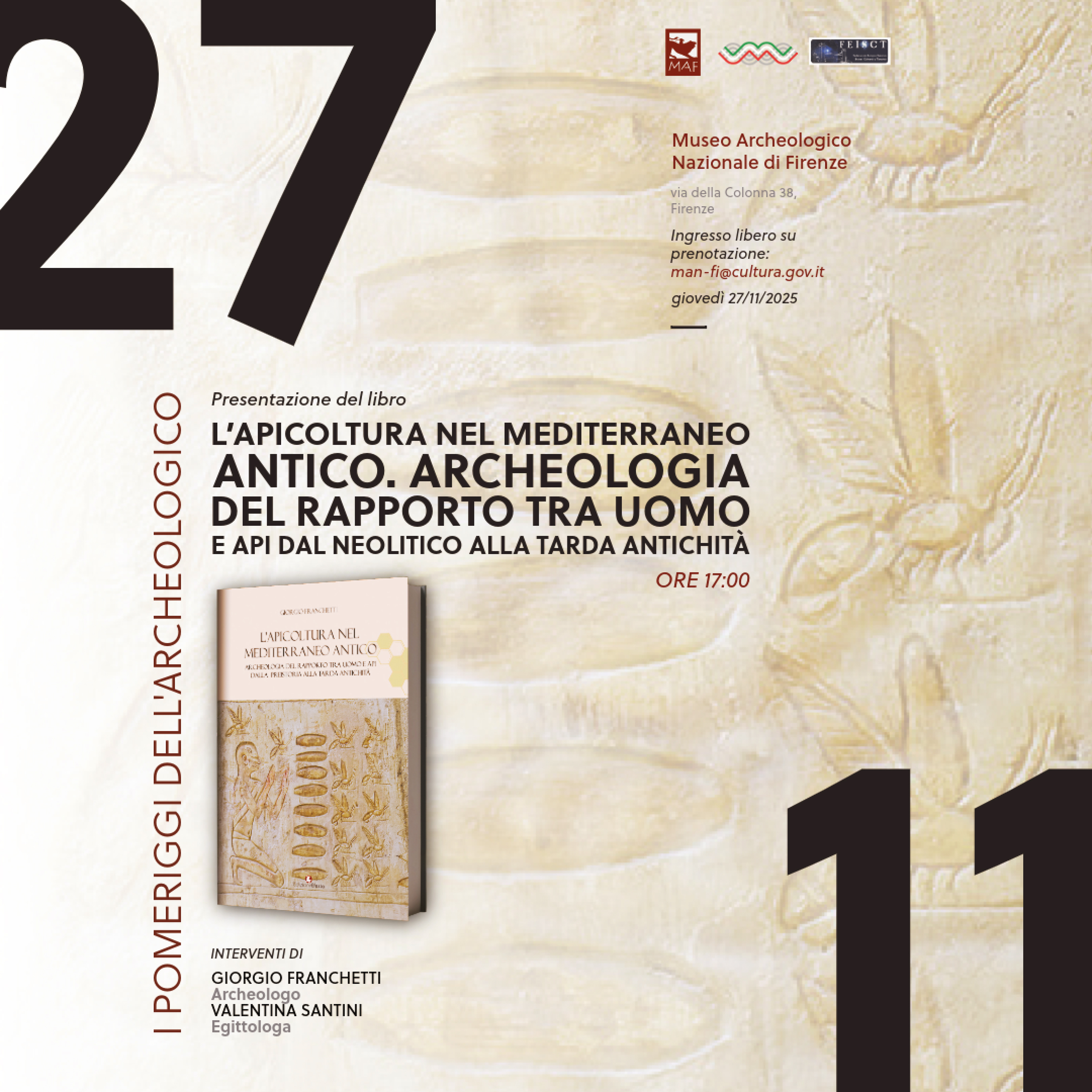 Alcuni milioni di anni fa i primi esemplari della specie homo fecero un incontro incredibile, che avrebbe per sempre segnato la vita dei futuri Sapiens. In un giorno qualunque, che sarebbe poi passato alla storia, per la prima volta i nostri antenati videro un organismo molto piccolo, che già da più di 90 milioni di anni popolava la Terra: l’ape. Nel libro “L’apicoltura nel Mediterraneo antico. Archeologia del rapporto tra uomo e api dal neolitico alla tarda antichità” di Giorgio Franchetti (Edizioni Efesto): l’autore ripercorre la storia, e in parte la preistoria, del rapporto uomo-ape andando alla ricerca di evidenze archeologiche confrontandole con le fonti scritte, con l’intento di raccontare un lato meno conosciuto delle pratiche in uso nel Mondo Antico e con l’accesa speranza di sensibilizzare le coscienze verso la tutela di questo nostro antichissimo alleato. Il libro sarà presentato giovedì 27 novembre 2025, alle 17, al museo Archeologico nazionale di Firenze, nell’ambito de “I pomeriggi dell’Archeologico” con gli interventi dell’autore Giorgio Franchetti e dell’archeologa Valentina Santini. Un viaggio nel tempo e nello spazio, tra archeologia e storia, ma anche entomologia, etnografia, paleobotanica, paleontologia, antropologia, reso possibile grazie alla preziosa collaborazione di professionisti ed esperti dei vari settori. Ingresso libero, prenotazione obbligatoria: man-fi@cultura.gov.it.