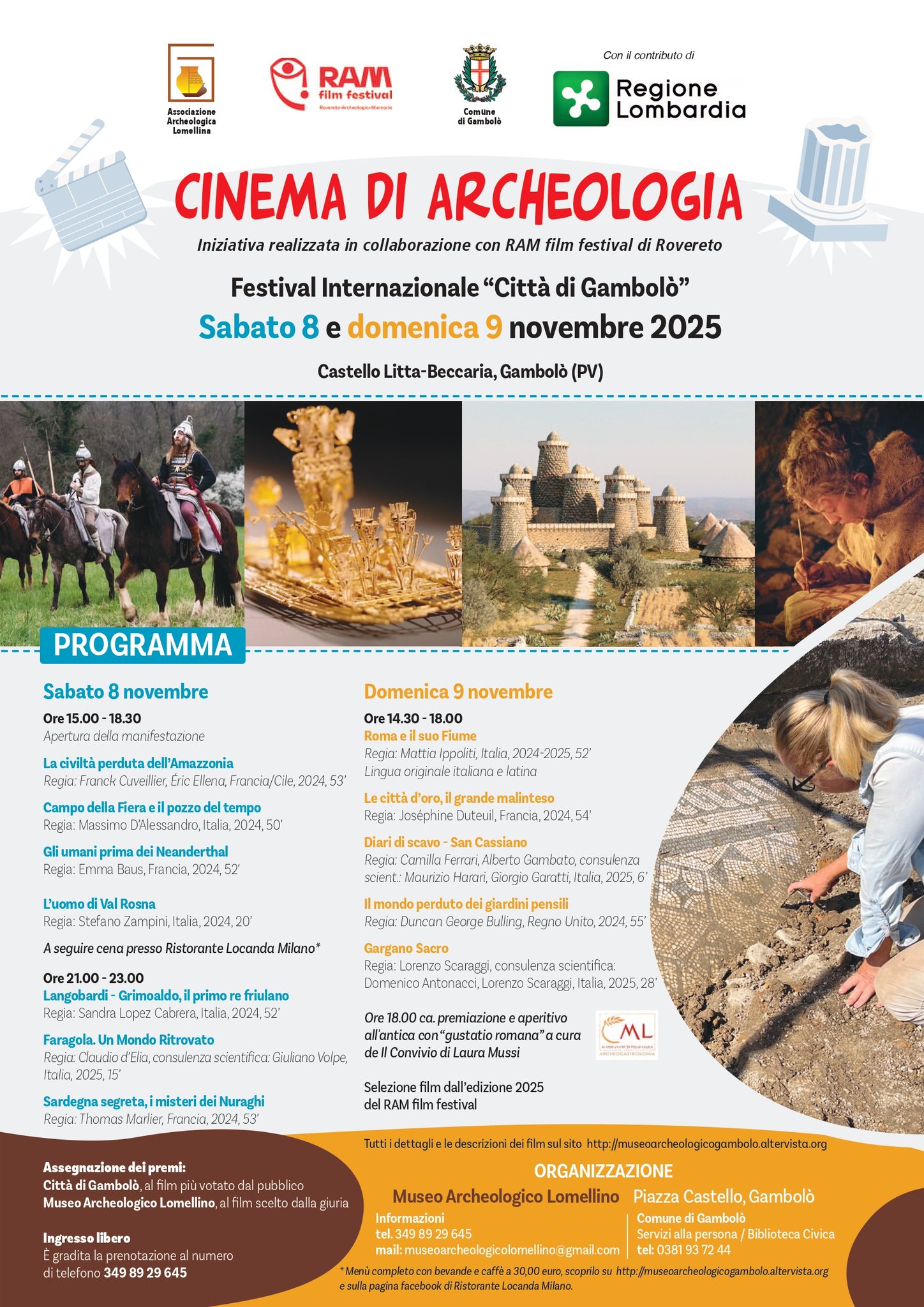 Sabato 8 e domenica 9 novembre 2025, al Castello Litta-Beccaria di Gambolò (Pv), la nuova edizione del “Cinema di Archeologia – Festival internazionale del cinema di archeologia – Città di Gambolò” promosso dal museo Archeologico Lomellino e dal comune di Gambolò con il contributo di Regione Lombardia, in collaborazione con il RAM Film Festival di Rovereto. Due giornate dedicate ai migliori film internazionali a tema archeologico, con proiezioni, incontri e la premiazione dei film vincitori.