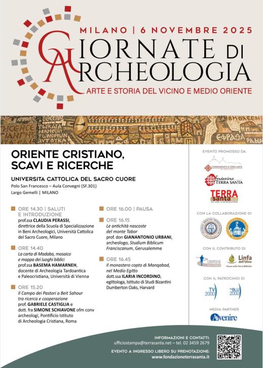 Milano, giovedì 6 novembre 2025, ore 14.30 – 17, università Cattolica del Sacro Cuore: Polo San Francesco – Aula Convegni (SF.301), largo Gemelli, Milano. Saluti e introduzione: prof.ssa CLAUDIA PERASSI, direttrice della Scuola di specializzazione in Beni archeologici, università Cattolica del Sacro Cuore, Milano. “Oriente cristiano: scavi e ricerche”. Intervengono: prof.ssa BASEMA HAMARNEH, docente di Archeologia Tardoantica e Paleocristiana, università di Vienna, “La carta di Madaba, mosaico e mappa dei luoghi biblici”; prof. GABRIELE CASTIGLIA, docente di Topografia dell’Orbis Christianus Antiquus, e dott. fra SIMONE SCHIAVONE ofm conv., archeologo, Pontificio Istituto di Archeologia cristiana (Piac), Roma, “Il Campo dei Pastori a Beit Sahour tra ricerca e cooperazione”; prof. don GIANANTONIO URBANI, professore di Archeologia biblica e Escursioni, Studium Biblicum Franciscanum, Gerusalemme, “Le antichità nascoste del Monte Tabor”; dott.ssa ILARIA INCORDINO, egittologa, Istituto di Studi Bizantini Dumberton Oaks, Harvard, “Il monastero copto di Manqabad, nel Medio Egitto”. Evento realizzato in collaborazione con lo Studium Biblicum Franciscanum di Gerusalemme e l’università Cattolica del Sacro Cuore. Con il contributo di Fondazione Homo Viator – San Teobaldo e Linfa dell’Ulivo 2025, Vicenza.