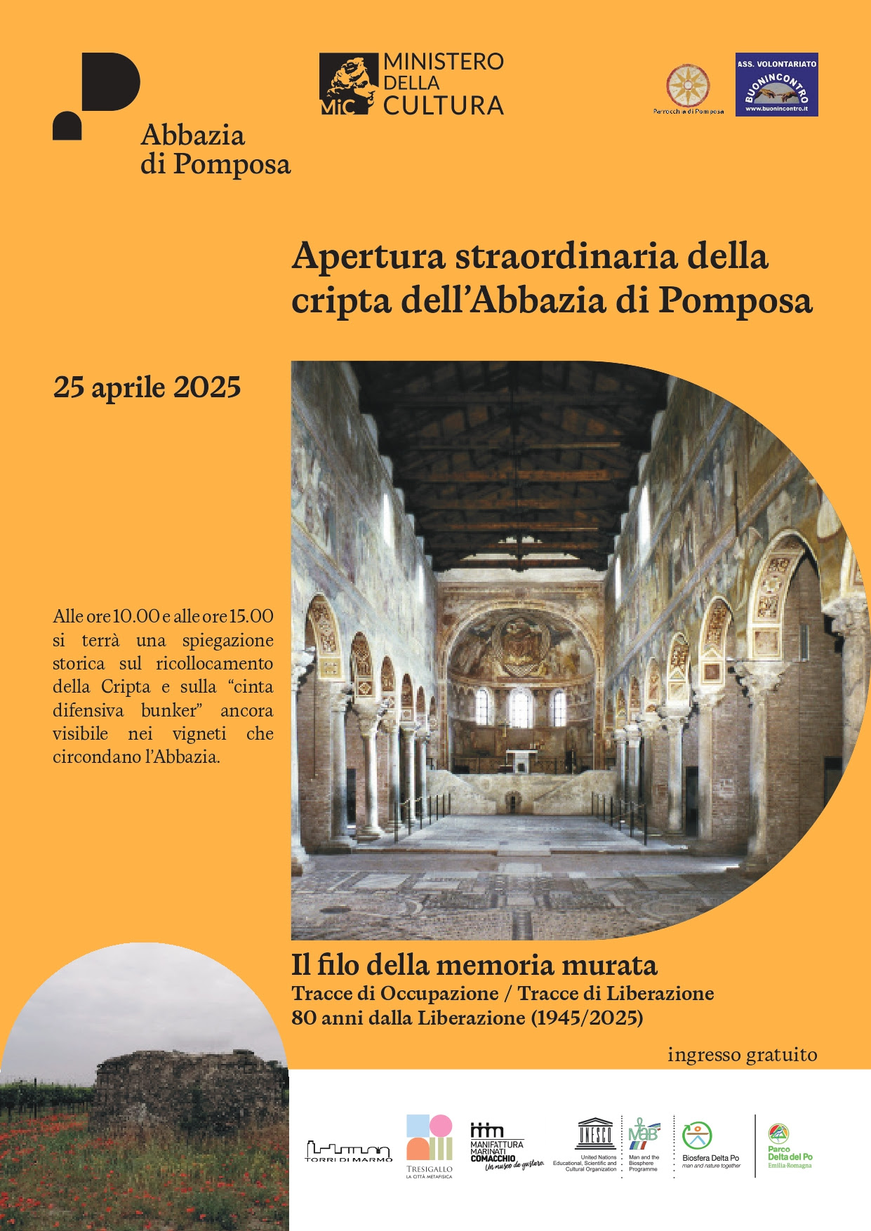 80mo anniversario della Liberazione speciale all’abbazia di Pomposa (Codigoro, Fe). Venerdì 25 aprile 2025, alle 10 e alle 15, l’Abbazia di Pomposa e il museo Pomposiano organizzano l’apertura straordinaria della cripta dell’Abbazia di Pomposa “Il filo della memoria murata” con spiegazione storica sul ricollocamento della Cripta e sulla “cinta difensiva bunker” ancora visibile nei vigneti che circondano l’Abbazia di Pomposa. L’ingresso è gratuito.