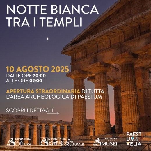 Il 10 agosto 2025, nella notte di San Lorenzo, quando il cielo si riempie di stelle cadenti e desideri, il parco archeologico di Paestum apre le sue porte per un’esperienza indimenticabile: la “Notte Bianca tra i Templi”, giunta alla sua quarta edizione. Dalle 20 fino alle 2, con ultimo ingresso alle 1.15, l’intera area archeologica si trasforma in un grande palcoscenico a cielo aperto, dove arte, musica, danza, teatro, poesia e sapori dialogano con la storia millenaria dei templi. Un percorso emozionale e immersivo che, dal Santuario Meridionale con il Tempio di Nettuno e la cd. Basilica attraversa il Foro e il Tempio della Pace, fino a raggiungere il Tempio di Athena. Un viaggio tra archeologia e creatività contemporanea, pensato per coinvolgere il pubblico con sette aree tematiche e tanti appuntamenti da non perdere. Biglietto serale di ingresso all’area archeologica 15 euro. Acquista online: Vivaticket – Notte Bianca 2025. L’iniziativa è inclusa nell’abbonamento Paestum&Velia. Biglietto Laboratorio del Gusto 10 euro. Per partecipare alla Notte Bianca è disponibile un servizio navetta gratuito da Velia a Paestum e ritorno. Partenza dal parcheggio dell’area archeologica di Velia ore 19. Rientro dal parcheggio del Bar Anna a Paestum a mezzanotte. Il ticket è gratuito e va ritirato presso le biglietterie dei Parchi prima della partenza unitamente al biglietto di ingresso. La prenotazione non è obbligatoria, ma è possibile riservare un posto chiamando il numero: +393914777583.
