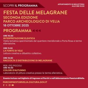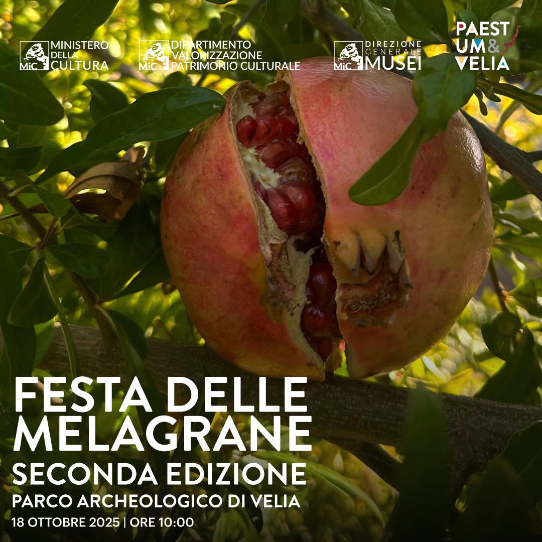 Sabato 18 ottobre 2025, il Parco archeologico di Velia si tinge dei colori e dei profumi dell’autunno con la seconda edizione della “Festa della Melagrana”, una giornata che unisce cultura, natura e gusto. A partire dalle 10 sarà possibile vivere un’esperienza immersiva tra visite tematiche, laboratori e attività di raccolta frutti: dall’Interpretazione eleatica, una visita unica tra Porta Rosa e le terme ellenistiche, alla Fonte di Yele, momento di lettura creativa e confronto collettivo. Non mancherà un piccolo momento riservato al gusto che prevede la raccolta e la distribuzione di melagrane, frutto simbolo di fertilità e rinascita, insieme ad uno spazio speciale dedicato ai più piccoli con il laboratorio di pittura “Colori d’autunno”. Un’occasione per scoprire, tra archeologia e convivialità, l’anima più autentica del territorio cilentano. L’iniziativa, inclusa nel biglietto d’ingresso ai Parchi e nell’abbonamento Paestum&Velia, si concluderà alle 13.