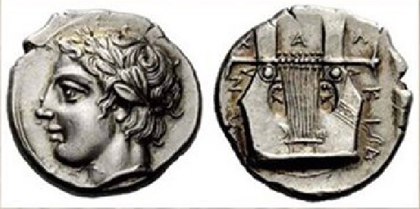 Una cetra a sette corde sul rovescio di una tetradracma della zecca di Olinto (Macedonia) del 410-400 a.C.