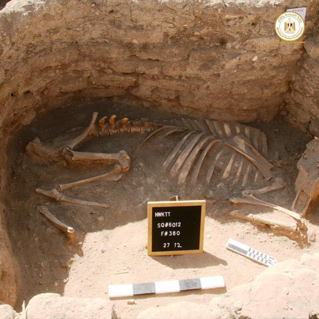 In tutte le aree scavate, la missione ha trovato molti strumenti utilizzati in una sorta di attività industriale come la filatura e la tessitura. Sono state portate alla luce anche scorie di lavorazione del metallo e del vetro, ma l’area principale di tale attività deve ancora essere scoperta. All’interno di una delle stanze sono state trovate due insolite sepolture di una mucca o di un toro. Sono in corso indagini per determinare la natura e lo scopo di questa pratica. E ancora più notevole è la sepoltura di una persona trovata con le braccia tese lungo i fianchi, e resti di una corda avvolta intorno alle ginocchia. La posizione della sepoltura e la deposizione di questo scheletro sono piuttosto strane e sono in corso ulteriori indagini. È stato inoltre ritrovato un contenitore contenente due galloni di carne essiccata o bollita (circa 10 kg) che reca una preziosa iscrizione: “Anno 37, carne condita per la terza festa di Heb Sed dal macello del recinto per bestiame di Kha fatta dal macellaio luwy”. Questa preziosa informazione non solo ci dà i nomi di due persone che hanno vissuto e lavorato nella città, ma conferma anche che la città era attiva e ha determinato il tempo della co-reggenza del re Amenhotep III con suo figlio Amenhotep IV / Akhenaten. La missione ha anche trovato un testo inciso sull’impronta di un sigillo che recita: “gm pa Aton” che può essere tradotto come “il dominio dell’abbagliante Aten”, e questo è il nome di un tempio costruito dal re Akhenaten a Karnak. A nord dell’insediamento è stato anche scoperto una grande necropoli, la cui estensione non è stata ancora determinata, e la missione ha scoperto un gruppo di tombe scavate nella roccia di varie dimensioni, a cui si accede tramite scale scavate nella roccia, che mostrano una caratteristica comune alla costruzione delle tombe nella Valle dei Re e nella Valle dei Nobili. Gli scavi sono ancora in corso e la missione prevede di scoprire tombe incontaminate piene di tesori.