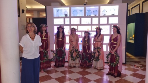 Alberta Facchi, direttrice del Man Adria, con le ragazze del Gruppo Danze Antiche di Villadose (Ro) nella sala dei Vetri romani del MAN Adria (foto graziano tavan)