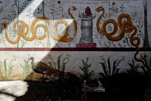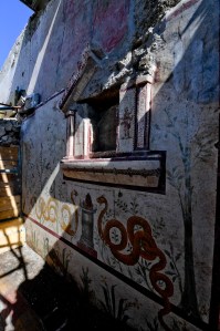 Serpenti agatodemoni e pavoni popolano il larario scoperto negli scavi della Regio V a Pompei (foto di Ciro Fusco)