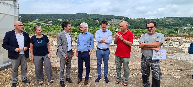 Il gruppo di lavoro per il parco archeologico in sopralluogo alla villa dei Mosaici di Negrar di Valpolicella: da sinistra, il sindaco Roberto Grison, il soprintendente Vincenzo Tinè, l’architetto Luca Dolmetta, l’archeologo Gianni De Zuccato, l’archeologo Alberto Manicardi, l’architetto Giovanna Battista, e i rappresentanti delle aziende agricole Benedetti e Franchini (foto sabap-vr)