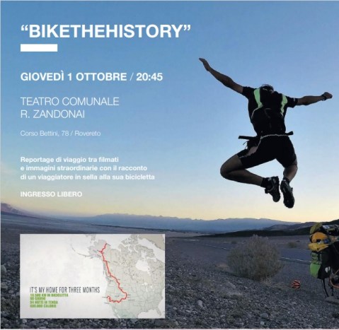 Raccontare i territori attraverso i luoghi della storia e gli aspetti più caratteristici del paesaggio culturale e naturale: è questa la filosofia dichiarata del progetto sportivo e culturale “Bike the History – la storia in bicicletta” evento speciale della Rassegna internazionale del Cinema Archeologico di Rovereto. Appuntamento giovedì 1° ottobre 2020, alle 20.45, al teatro Zandonai di Rovereto. Protagonista, Alessandro De Bertolini, ricercatore presso la Fondazione Museo Storico del Trentino, pubblicista, autore e documentarista, in collaborazione con Montura Editing. De Bertolini porterà gli spettatori (anche quelli on line: il programma è disponibile anche in streaming http://www.rassegnacinemaarcheologico.it/rassegnaonline), in viaggio, attraverso foto e filmati, dall’oceano Pacifico all’oceano Artico attraverso i grandi parchi degli Stati Uniti, i deserti e le praterie dell’Ovest, le salite delle Rocky Mountains, i silenzi del Canada e le infinite solitudini delle terre d’Alaska. Nel mese di maggio 2017 Alessandro De Bertolini parte da solo con la sua bicicletta (“It’s my home for three months”, dice) dalle coste della California in direzione delle Montagne Rocciose, e di lì fino in cima all’Alaska, dove finisce il continente. Il viaggio si conclude all’inizio di settembre, dopo 90 giorni e 10.500 km in bicicletta, con tenda e sacco a pelo. Da questo progetto di “bikethehistory” nascono un film e un libro il cui ricavato, in linea con la filosofia editoriale di Montura Editing, viene devoluto alla Onlus Senza frontiere, che sostiene l’istituto Rarahil Memorial School di Kathmandu in Nepal.
