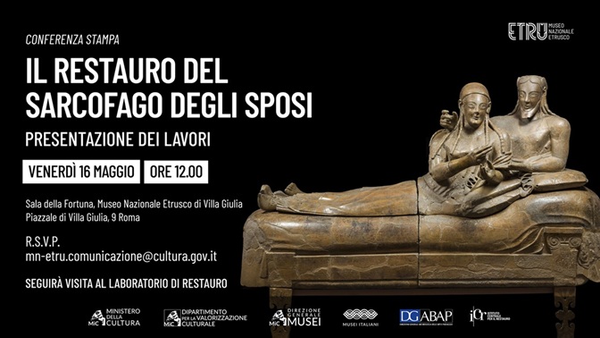 Venerdì 16 maggio 2025, alle 12, in sala della Fortuna, al museo nazionale Etrusco di Villa Giulia a Roma, presentazione del restauro del Sarcofago degli Sposi, il capolavoro assoluto dell’arte etrusca risalente a 2500 anni fa. A distanza di oltre un secolo dal primo restauro che consentì di ricomporre da centinaia di frammenti di terracotta la celebre coppia di Sposi in un unico tenero abbraccio e a più di mezzo secolo dall’ultimo intervento manutentivo, il museo nazionale Etrusco di Villa Giulia, in collaborazione con l’Istituto Centrale per il Restauro, ha avviato la prima fase di un nuovo intervento di conservazione e restauro che consentirà di definire metodi, materiali e tempistiche per l’intervento complessivo di restauro del Sarcofago, che sarà realizzato grazie al sostegno di un mecenate privato. Interverranno il capo dipartimento per la valorizzazione del patrimonio culturale, Alfonsina Russo; il direttore generale Musei, Massimo Osanna; la direttrice del museo nazionale Etrusco di Villa Giulia, Luana Toniolo; il direttore dell’Istituto Centrale per il Restauro, Luigi Oliva; il presidente della Banca Popolare del Cassinate, Vincenzo Formisano. Grazie alla convenzione fra il Museo e l’Istituto Centrale per il Restauro, il Sarcofago degli Sposi è al centro di una nuova stagione di studi che prevede non solo il restauro ma anche la realizzazione di un piano conservativo, di manutenzione dell’opera e di valorizzazione. Inoltre, per raccontare ai visitatori questo momento delicato del percorso conservativo del Sarcofago, il museo nazionale Etrusco di Villa Giulia aprirà al pubblico le porte del laboratorio di restauro per due giorni alla settimana.