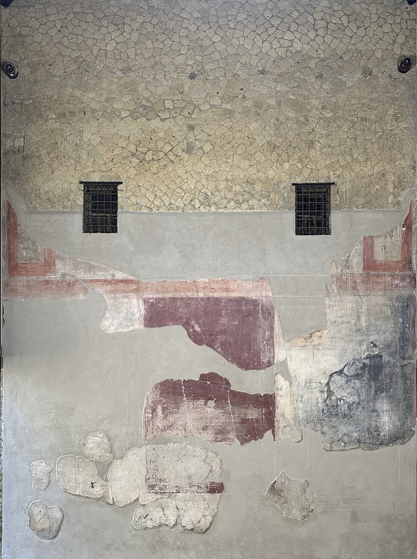 Casa dell’Erma di Bronzo a Ercolano: la parete alla fine del riposizionamento dei frammenti di affresco (foto paerco)