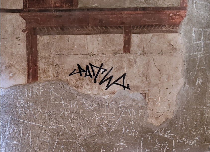 Casa dell’Erma di Bronzo a Ercolano: dettagli sull’intervento di restauro della scritta-sfregio (foto paerco)