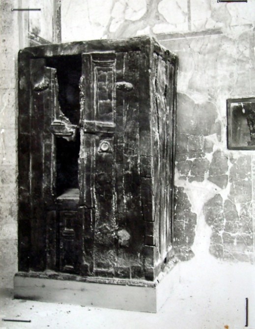 Lo straordinario armadietto/credenza in legno carbonizzato è stato rinvenuto con tutto il suo contenuto durante gli scavi del 1937 accanto alla Casa del Bicentenario (foto paerco)