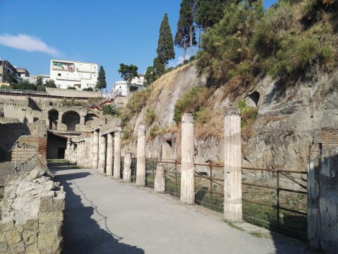 La sede degli Augustali, nel cuore di Ercolano, ritmata dalle grandi colonne. In primo piano le basi che sorreggevano le statue di Augusto e Cesare (foto Graziano Tavan)