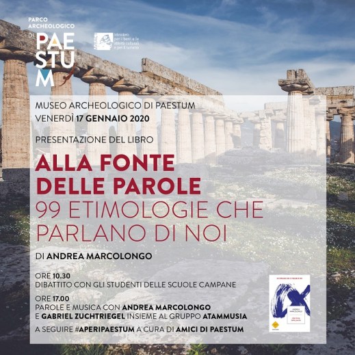 La mattinata di venerdì 17 gennaio 2020 sarà dedicata all’incontro con gli alunni dei licei campani, futuri custodi delle parole e veri protagonisti del dibattito, trasmesso anche in diretta radiofonica sulle frequenze di Radio Castelluccio. “Gli studenti del liceo classico di Eboli hanno molta familiarità con i libri della Marcolongo”, spiega la professoressa Rosa Caponigro, “li portano nello zaino insieme al libro di grammatica perchè sono strumenti che aiutano a comprendere meglio questa “lingua geniale”: il greco. Grazie ad Andrea, i ragazzi vanno al di là della sintassi e delle traduzioni e apprezzano la lingua antica quale espressione di un mondo che in fondo gli è proprio, ma ancora non lo sanno. La principale difficoltà che trovano gli alunni è comprendere i tempi verbali, spesso senza comparazione nelle lingue moderne. La Marcolongo spiega che i Greci non si ponevano la domanda quando avviene un’azione, ma come avviene. Questo colpisce molto l’attenzione degli studenti perché riescono a dare un senso alle cose che studiano, non percependole come inutili”. Nel pomeriggio, dalle 17, gli spazi del museo si arricchiranno di parole e di musica. I protagonisti saranno l’autrice e il gruppo ATAMMUSÌA, moderatore il direttore Gabriel Zuchtriegel. Dopo l’incontro, Paestum dà il via agli aperitivi 2020, a cura dell’Associazione Amici di Paestum.