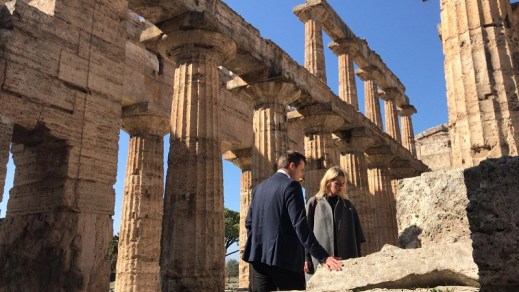 Il direttore Gabriel Zuchtriegel e la scrittrice Andrea Marcolongo al tempio di Nettuno (foto parco archeologico Paestum)