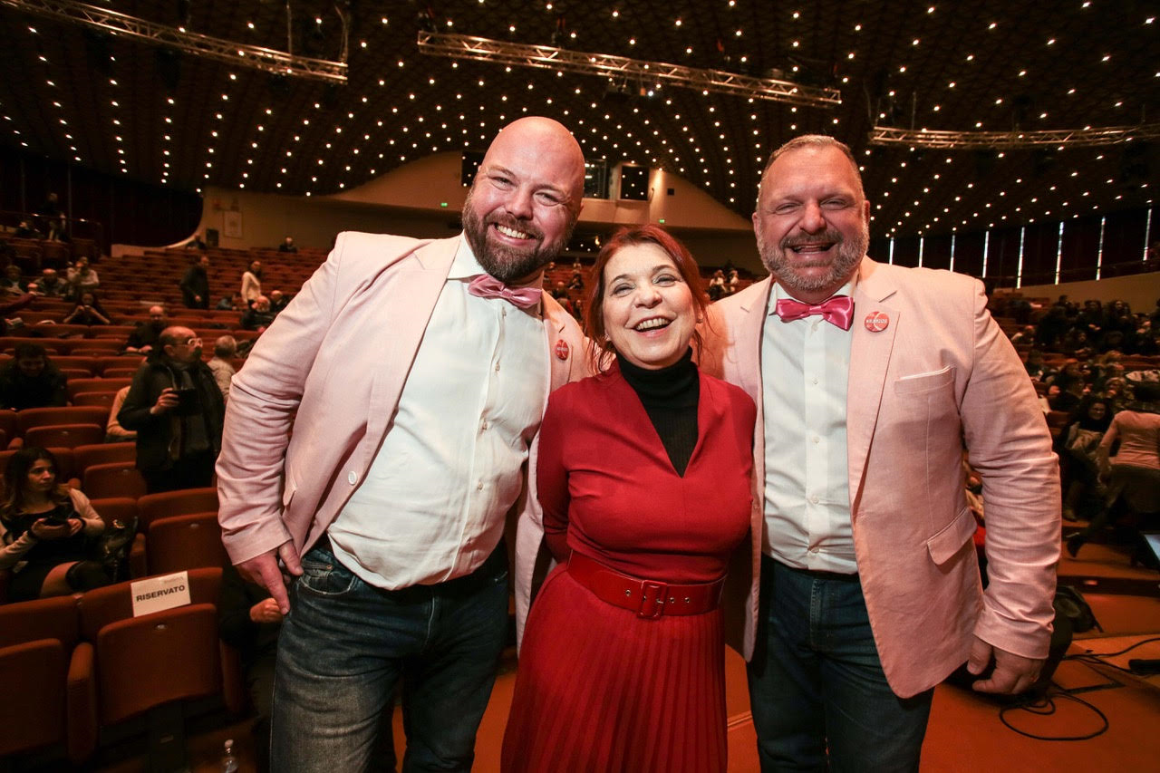 La giuria del premio Francovich con al centro Syusy Blady, i due registi Marco Melluso e Diego Schiavo, e l’attore Luciano Manzalini sul palco di Tourisma (foto Graziano Tavan)