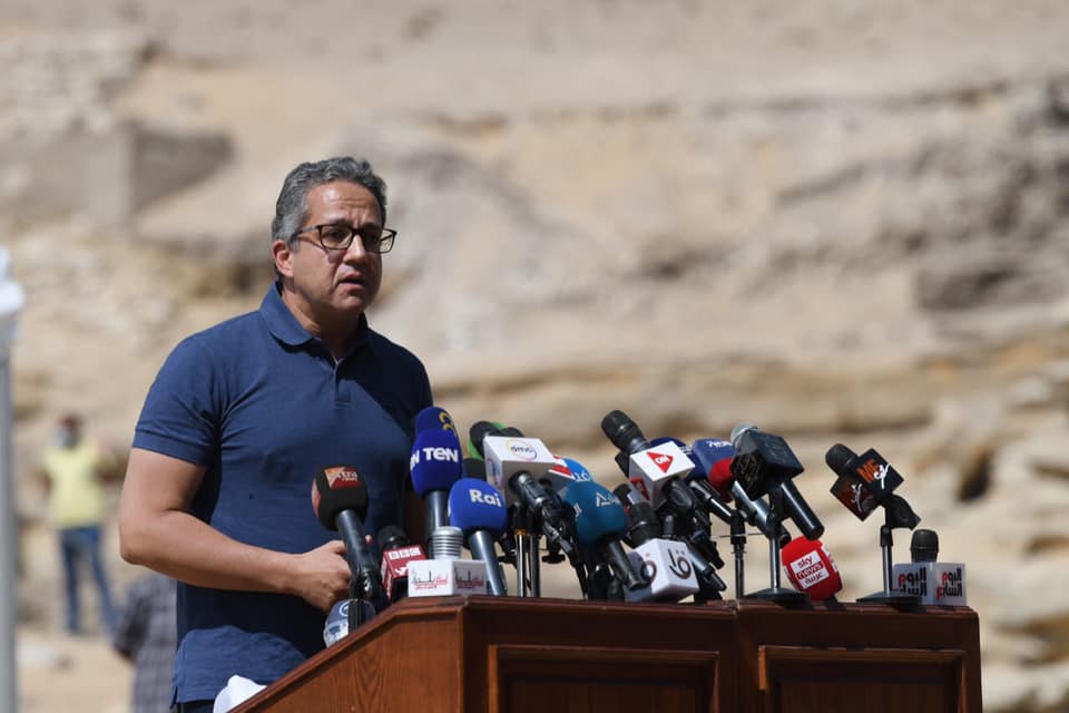 “Questo è un giorno importante per l’Egitto”, ha esordito el-Anani: “Questa scoperta conferma l’unicità dell’Egitto riconosciuta da tutto il mondo. E la partecipazione oggi di tanti ambasciatori di 43 Paesi amici dell’Egitto e di media stranieri ne è la conferma”. Il ministro ha ricordato le tappe delle ricerche della missione egiziana in un’area, quella di Saqqara, particolarmente importante, Patrimonio dell’Umanità dal 1979, famosa per la piramide a gradoni di Djoser, che è stata riaperta al pubblico proprio nel marzo 2020 dopo un lungo restauro, iniziato nel 2006 e interrotto nel 2011 e completato nuovamente con un finanziamento egiziano di 150 milioni di sterline: “Inizialmente, tra la fine di agosto e il primi di settembre 2020 sono stati scoperti 3 pozzi contenenti 13 bare; due settimane dopo sono state trovate altre 14 bare, e ad oggi siamo arrivati a 59 (vedi https://archeologiavocidalpassato.com/2020/09/21/egitto-la-missione-archeologica-egiziana-nella-necropoli-di-saqqara-ha-scoperto-27-sarcofagi-di-epoca-tarda-risalenti-a-2500-anni-fa-ancora-sigillati-il-ministro-el-anani-una-scoperta-mo/). Ma non è ancora finita. Abbiamo trovato altri strati di bare che verranno illustrati più avanti”. Khaled el-Anani ha spiegato che i sarcofagi trovati sono in buone condizioni di conservazione e conservano ancora i loro colori originali: “I primi studi effettuati dagli archeologi rivelano che risalgono alla XXVI dinastia e che appartengono a un gruppo di sacerdoti, diplomatici anziani e personalità di spicco nella società”. E poi l’annuncio ufficiale: “Questi sarcofagi saranno trasferiti al Grand Egyptian Museum per essere esposti nella sala di fronte a quella dedicata alla presentazione del nascondiglio di Al-Asasif, vicino al tempio della regina Hatshepsut (riva occidentale dell’odierna Luxor), trovato dalla missione archeologica egiziana nel 2019, dove sono state scoperte circa 32 bare chiuse ancora perfettamente integre di sacerdoti, alcune donne e bambini risalenti alla XXI-inizio XXII dinastia”.