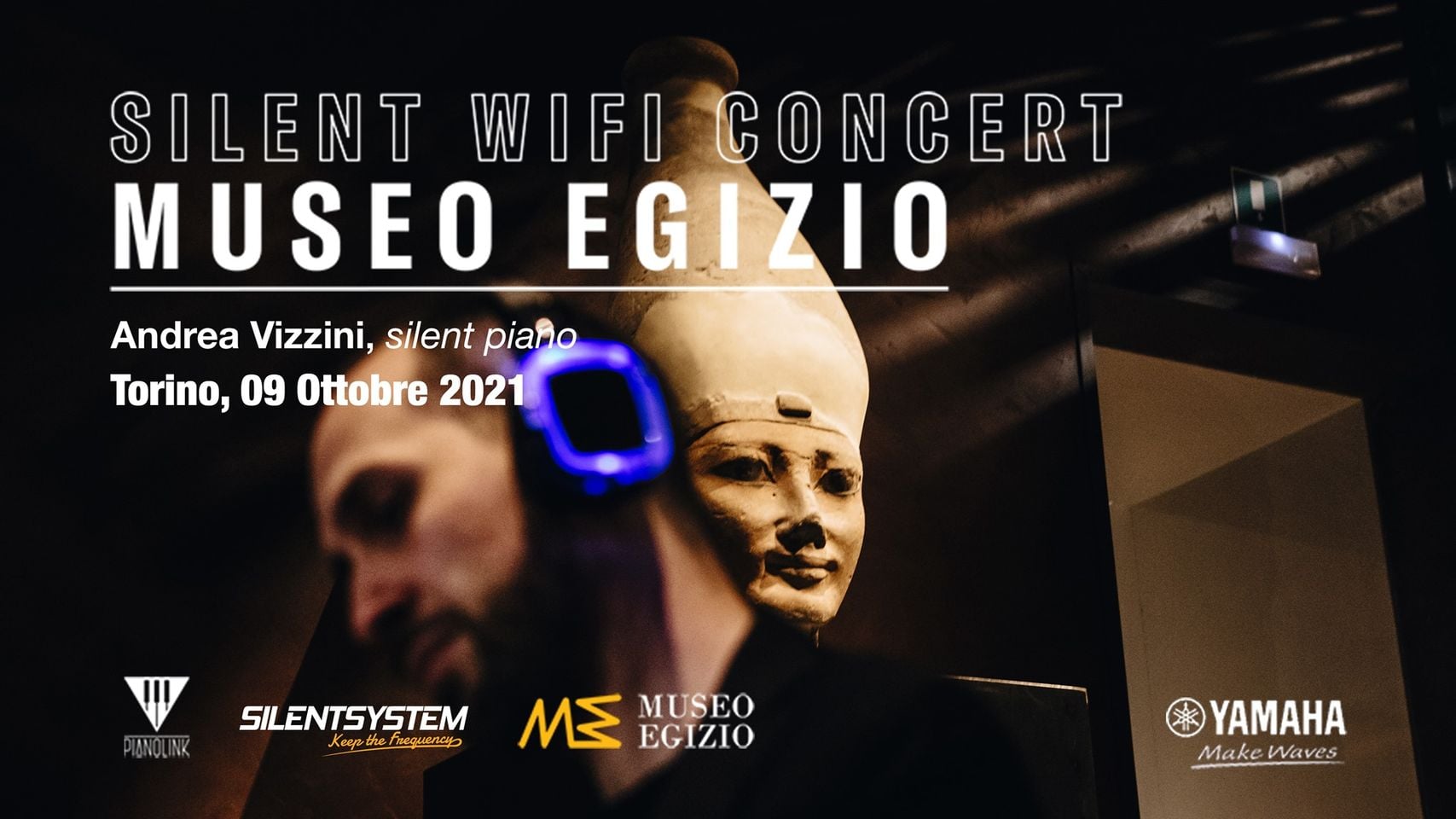 Ammirare l’imponente statuario e i reperti archeologici dell’antico Egitto e allo stesso tempo ascoltare un concerto di musica classica e un reading di poesie dedicate alla notte: è il “Silent Wifi Concert”. Succede a Torino al museo Egizio, la sera di sabato 9 ottobre 2021, dove il pubblico, passeggiando tra le sale del Museo, attraverso un sistema di cuffie wi-fi ad alta fedeltà, potrà ascoltare live al piano Andrea Vizzini e la voce narrante Antonio Gargiulo. Il museo Egizio in collaborazione con PianoLink e Yamaha Music Europe branch Italy offre dunque una nuova esperienza ai suoi visitatori. Un percorso di musica e poesia dedicato alla notte, da ascoltare in cuffie wi-fi ad alta fedeltà. Un modo nuovo di vivere e ascoltare il museo: liberi di passeggiare tra le sale, accompagnati dalle note del pianoforte di Andrea Vizzini.