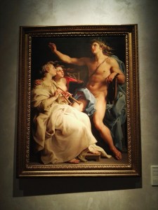Con il mito di Apollo e Marsia celebrato, come abbiamo visto, nel Salone di Apollo, si esalta l’arte della musica e del bel canto al suono della lira. Con la vittoria di Apollo sul satiro Marsia esperto suonatore di flauto, le Muse decretano la superiorità degli strumenti a corda su quelli a fiato. Il mito attestato in Grecia dalla metà del V sec. a.C. e documentato vivacemente nel vaso apulo del IV sec. a.C. conservato al Mann esposto in mostra a Vicenza, ebbe grande popolarità nell’arte romana di ambito privato come testimoniano l’affresco da Pompei e il celebre “sigillo di Nerone”, gemma della fine del I sec. a.C. entrata a far parte della collezione di Lorenzo de’ Medici alla fine del XV secolo e oggi al Mann: Apollo è a sinistra, in piedi. Con la sinistra tiene la cetra e con la destra il plettro. A destra, seduto su una roccia è Marsia, legato con le braccia dietro la schiena a un albero disseccato. È il momento prima della fine del mito quando Marsia viene punito per la sua tracotanza (hybris). Chiudono questa sezione due opere. Una antica: la statuetta di Apollo citaredo del II sec. d.C., proveniente dall’Archeologico di Venezia, ritratto mentre nudo pizzica il suo strumento preferito: la cetra. L’altra moderna, a conferma del mito che continua: è una tela di Pompeo Batoni del 1741 con Apollo, la Musica e la Geometria, dove il pittore realizza l’allegoria delle arti, in cui Apollo rappresenta la Poesia.