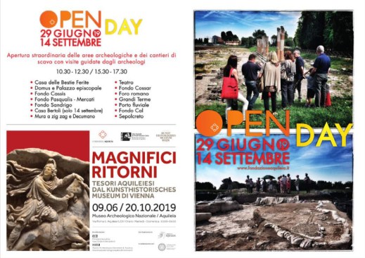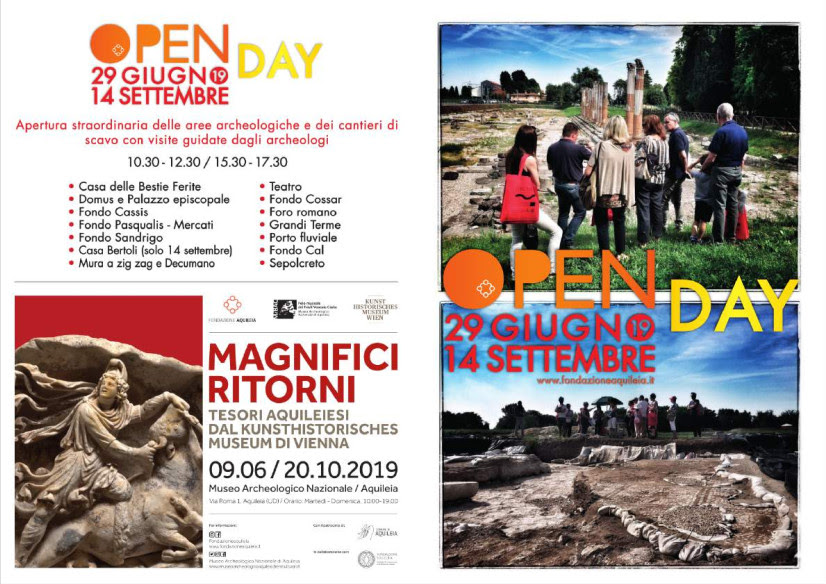 Aquileia apre le porte ad appassionati e turisti per l’Open Day di sabato 14 settembre 2019. Previsti l’apertura delle aree archeologiche e dei cantieri di scavo; visite guidate con i curatori della mostra “Magnifici ritorni” al museo Archeologico nazionale; e gran finale con il concerto in basilica. Grazie alla collaborazione tra Fondazione Aquileia, soprintendenza Archeologia Belle arti e Paesaggio del Friuli Venezia Giulia, Comune di Aquileia, università di Padova, di Trieste, di Udine, di Venezia e di Verona, Pro Loco Aquileia, associazione nazionale per Aquileia, Società Friulana di Archeologia tutte le aree archeologiche e i cantieri di scavo saranno aperti al pubblico e archeologi e studiosi aspetteranno cittadini e appassionati sugli scavi per raccontare le ultime scoperte e i risultati delle indagini più recenti.