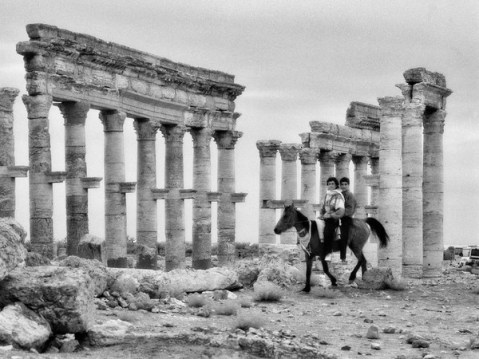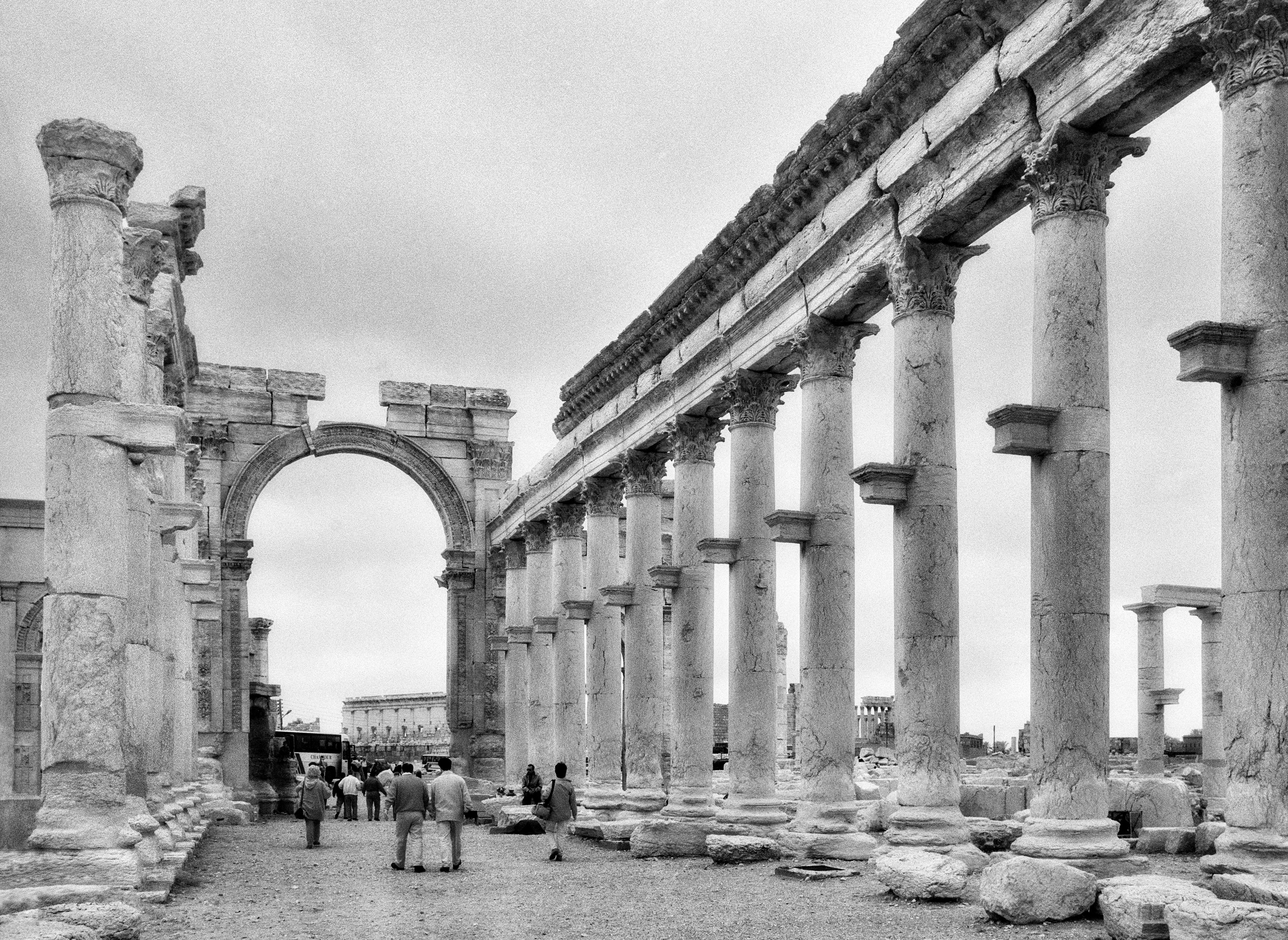 La via colonnata di Palmira chiusa dal monumentale arco trionfale (distrutto dall’Isis) in una foto di Elio Ciol del 1996