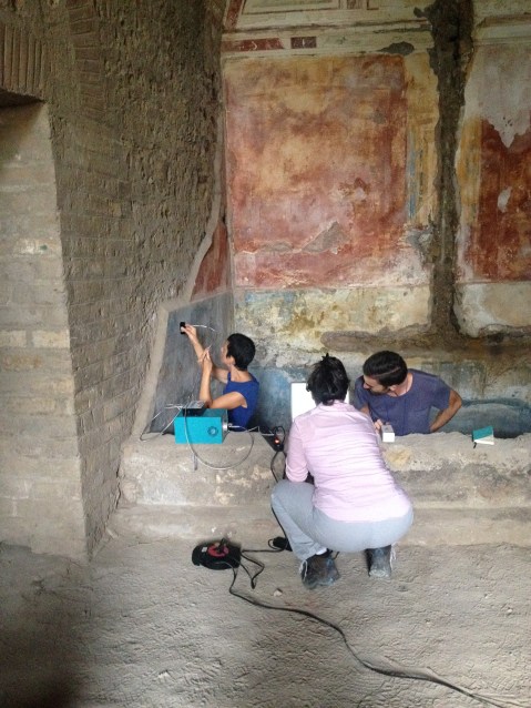 Le indagini archeometriche. “L’unità di ricerca ha investigato i materiali delle Terme del Sarno a diverse scale spaziali e con tecniche di avanguardia”, sostiene Gilberto Artioli, responsabile dell’Unità di Ricerca sullo studio archeometrico dei materiali e sulle indagini geofisiche. “Tutti i materiali presenti nell’edificio, usati sia nelle fasi costruttive che nelle fasi di restauro (unità murarie – mattoni, litica; leganti – malte, intonaci; pigmenti) sono stati identificati e caratterizzati a livello microscopico e sub-microscopico per individuarne la natura, l’origine, la distribuzione e la loro funzione architettonica, strutturale o decorativa. Discussi in modo coordinato con i risultati ottenuti dagli altri gruppi di ricerca, i dati fino ad ora misurati sui materiali forniscono una solida base per la comprensione e l’interpretazione strutturale dell’edificio, la ricostruzione della storia architettonica e conservativa, e un punto di partenza per la proposta di conservazione futura”.