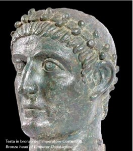 Questo territorio nel medio e tardo impero conobbe uno sviluppo eccezionale, grazie anche ai favori dei numerosi imperatori che vi nacquero: da Ostiliano a Costanzo III, passando attraverso Costantino il Grande. In questi luoghi diverse relazioni sociali e impulsi culturali provenienti dal territorio italico e dalle province orientali hanno trovato una sintesi. Le tradizioni locali si fusero ben presto con la cultura romana lasciandoci opere di grande valore in una regione che con la riorganizzazione amministrativa e municipale vide sorgere grandiose ville imperiali, come quella di Mediana presso Naissus (Niš), a volte nella forma di fortezza, come a Felix Romuliana (Gamzigrad), o nuovi lussuosi quartieri urbani su iniziativa dei regnanti che, nel caso di Sirmium (Sremska Mitrovica), potevano anche includere la presenza di un palazzo con il circo, come ad Aquileia. Alcune opere, che vengono riunite eccezionalmente nell’esposizione, sono da annoverare tra le più significative creazioni artigianali o artistiche dell’epoca: le maschere da parata in bronzo ci restituiscono tutto il solenne cerimoniale dell’esercito romano e gli elmi tardoantichi di ufficiali, in particolare quello ritrovato a Berkasovo, dorato e tempestato di elementi in pasta vitrea multicolore a imitazione delle pietre dure, sono un vero e proprio capolavoro. La testa in porfido rosso dell’imperatore Galerio proveniente da Gamzigrad e la mano sinistra con globo sembra siano appartenute ad una figura colossale che poteva rappresentare Galerio come dominatore del mondo. Uno dei reperti più preziosi esposto in mostra è il cosiddetto cammeo di Belgrado in sardonica a più strati, con l’imperatore a cavallo trionfante sopra il nemico sconfitto. Ma il pezzo di arte e di propaganda politica più rappresentativo del tempo di Costantino è la famosa testa in bronzo con diadema dello stesso imperatore parte di una statua dorata rinvenuta nella città natale Naissus, esempio di magnificenza imperiale.