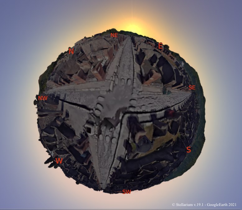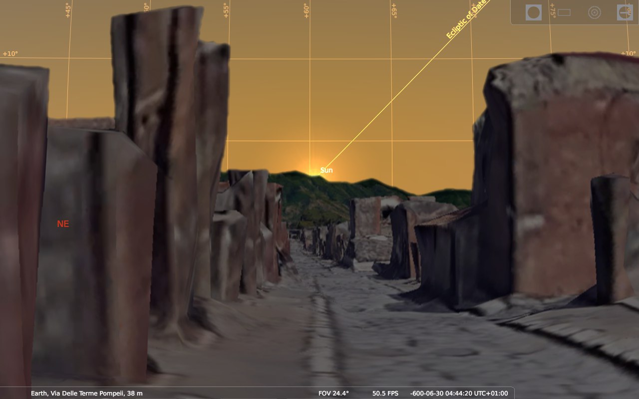 Il solstizio estivo, il momento estremo in cui il sole traccia nel cielo la sua orbita più lunga e raggiunge la posizione più estrema con punti di levata e tramonto verso settentrione, è l’apoteosi del ritmo annuale, il culmine della luce diurna: il sole sembra sostare per alcuni giorni in questa posizione prima di iniziare il suo percorso inverso e avviare il suo ritorno verso Sud e, con il decrescere delle giornate, verso il buio. Il ciclo delle stagioni è un orologio primordiale per la scansione dei ritmi dell’agricoltura, dell’allevamento, della pesca, delle guerre, sin dai tempi più remoti e permette una naturale integrazione tra uomo e ambiente. Il paesaggio celeste è dunque intrinsecamente legato alla città: esso non è solo una epifania lontana, ma ne permea e costruisce lo spazio. Come accade in altre città di fondazione greca, etrusca e romana, l’irraggiamento del sole era considerato un elemento fondante nella pianificazione urbana, per armonizzare l’orientamento con la direzione dei venti, con la morfologia del territorio e il deflusso delle acque. I dati raccolti in situ – frutto del programma specifico di studio e ricerca – permettono di simulare il movimento del sole e degli astri nei secoli lontani in cui fu fondata e visse Pompei e di verificare il sistema delle antiche misurazioni e gli orientamenti seguiti dagli antichi.