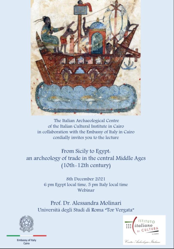 L’appuntamento è mercoledì 8 dicembre 2021, alle 17 ora italiana (18 ora egiziana) per il webinar “Dalla Sicilia all’Egitto: un’archeologia del commercio nel Medioevo centrale (X-XII sec.)” a cura di Alessandra Molinari dell’università di Roma Tor Vergata, promosso dal Centro archeologico italiano dell’Istituto italiano di Cultura al Cairo in collaborazione con l’ambasciata italiana al Cairo. La conferenza potrà essere seguita attraverso Microsoft Teams al link