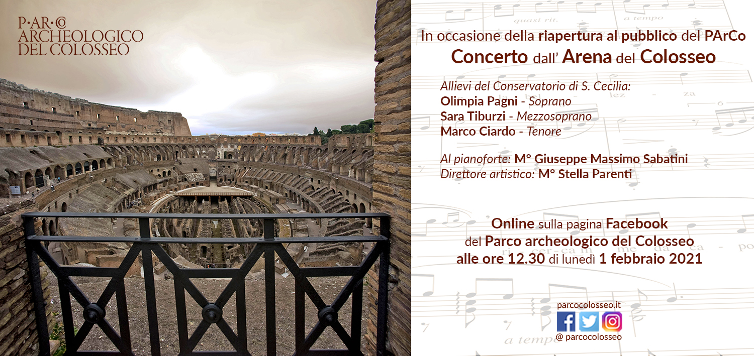 Concerto della speranza per la riapertura. “Con la consapevolezza che l’arte aiuta a superare momenti difficili come quelli che stiamo vivendo”, spiega la direzione, “il Parco archeologico del Colosseo offre ai visitatori che saranno presenti lunedì 1° febbraio, giornata di riapertura, e in diretta streaming sulla pagina Facebook per l’ampio pubblico che continua a seguire le numerose attività promosse sui canali social del PArCo, un concerto degli allievi del Conservatorio di S. Cecilia che si terrà sul piano dell’arena del Colosseo alle 12.30”. Sull’arena del Colosseo, dunque, gli Allievi del Conservatorio di S. Cecilia: Olimpia Pagni, soprano; Sara Tiburzi, mezzosoprano; Marco Ciardo, tenore; al pianoforte: Maestro Giuseppe Massimo Sabatini; direttore artistico: Maestro Stella Parenti. Il programma. Da “Così fan tutte” W. A. Mozart: Un aura amorosa; dalla “Bohème” G. Puccini: Quando meno vo’; dalla “Carmen” di Bizet: Habanera; da “Lakmé” di Léo Delibes: “Duetto dei fiori”; da “La Rondine” G. Puccini: “Chi il bel sogno di Doretta”; da “Sansone e Dalila” di Saint Saens: “Mon coeur s’ouvre à ta voix”; “La vie en rose” di Édith Piaf, eseguita a tre voci; dalla “Traviata” di G. Verdi: “Brindisi”. Diretta Facebook, in streaming sul canale Youtube #ParcoColosseo.