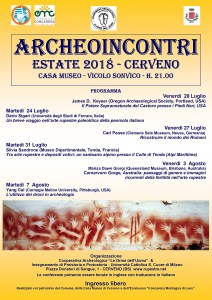 Parallelamente al campo scuola, a Cerveno, nella Casa Museo, sono previsti gli Archeoincontri, aperti al pubblico, con inizio sempre alle 21. Il ciclo apre venerdì 20 luglio 2018 con James D. Kayser della Oregon Archeological Society di Portland (Usa) su “Il potere soprannaturale del castoro presso i Piedi Neri, Usa”; martedì 24 luglio 2018 sarà la volta di Dario Sigari dell’università di Ferrara con un “Breve viaggio nell’arte rupestre paleolitica della penisola italiana”; con Carl Pause del Clemens Sels Museum di Neuss (Germania) venerdì 27 luglio 2018 si cambia periodo: “Ricostruire il mondo dei Romani”; martedì 31 luglio 2018, Silvia Sandrone del museo Dipartimentale di Tenda (Francia) parlerà di “Arte rupestre e depositi votivi: un santuario alpino presso il Colle di Tenda (Alpi Marittime)”; venerdì 3 agosto 2018 Marisa Down Giorgi del Queensland Museum di Brisbane propone al pubblico di appassionati quanto già approfindito con i partecipanti del campo scuola: “Carnarvon Gorge, Australia: paesaggi di genere, immagini ricorrenti di figure di fertilità nell’arte rupestre”; infine martedì 7 agosto 2018 con Yang Cai della Carnagie Mellon University di Pittsburgh si approfondiscono le nuove tecnologie applicate alla ricerca archeologica: “L’utilizzo dei droni in archeologia”.