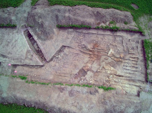 Foto dal drone delle strutture di fondazione in pietra arenaria della cavea del teatro (foto Paolo Nanni)