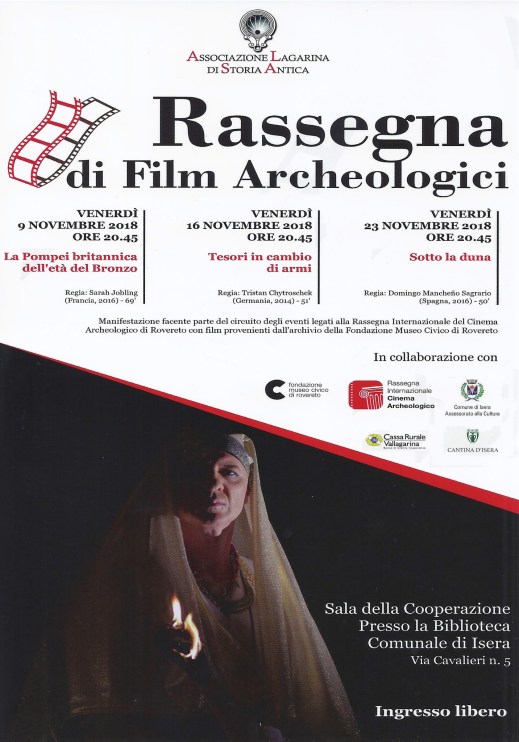 Tre film per altrettanti venerdì sera con il mondo antico a Isera. È la Rassegna di Film Archeologici, tre appuntamenti storico-culturali a ingresso libero nei venerdì 9, 16 e 23 novembre 2018 alle 20.45, nella sala della Cooperazione, sopra la Biblioteca Comunale di Isera, promossi dall’assessorato alla Cultura di Isera (Tn), in collaborazione con l’associazione Lagarina di Storia Antica, la Fondazione Museo Civico di Rovereto, la Cassa Rurale Vallagarina e la Cantina d’Isera. La Rassegna di Isera fa parte del circuito degli eventi legati alla Rassegna Internazionale del Cinema Archeologico di Rovereto con film provenienti dall’archivio della Fondazione Museo Civico di Rovereto.