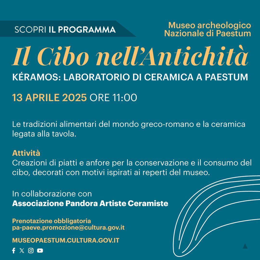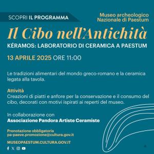 I parchi archeologici di Paestum e Velia invitano a vivere un’esperienza unica che unisce creatività, arte e storia con i laboratori di ceramica “KÉRAMOS”, in programma una volta al mese presso i Parchi fino a dicembre. Domenica 13 aprile 2025, il museo Archeologico nazionale di Paestum apre le porte al laboratorio creativo “IL CIBO NELL’ANTICHITÀ”, un’occasione speciale per riscoprire le tradizioni alimentari e l’arte della ceramica del mondo greco-romano. Un viaggio nel tempo attraverso forme, colori e sapori guiderà alla scoperta della quotidianità antica, tra piatti, anfore e decori ispirati ai reperti esposti nel Museo. Un modo coinvolgente per toccare con mano la storia, immergendosi nei saperi artigianali che da sempre raccontano il legame tra cibo e cultura. Prenotazione obbligatoria alla mail pa-paeve.promozione@cultura.gov.it.