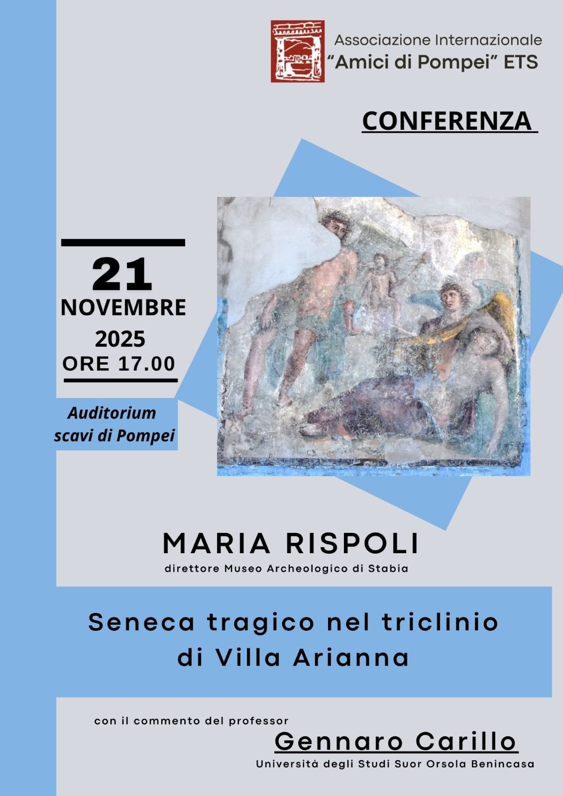 “Seneca tragico nel triclinio di Villa Arianna” è il titolo dell’incontro proposto dall’associazione internazionale Amici di Pompei ETS con l’archeologa Maria Rispoli, direttore del museo Archeologico di Stabia. La conferenza verrà arricchita da un commento del professor Gennaro Carillo, ordinario di Storia del Pensiero politico nel dipartimento di Scienze umanistiche dell’università Suor Orsola Benincasa di Napoli. Appuntamento venerdì 21 novembre 2025, alle 17, all’auditorium degli Scavi di Pompei. Durante l’incontro verrà presentata una rilettura del noto ciclo pittorico del triclinio di Villa Arianna dell’antica Stabia, dimora romana il cui nome deriva dalla riscoperta, sulla parete di fondo del triclinio, della raffigurazione del mito di Dioniso che incontra Arianna abbandonata da Teseo sull’isola di Nasso. Il ciclo pittorico, risalente all’epoca neroniana, si ispira, secondo Maria Rispoli, integralmente alle tragedie di Seneca e alla sua poetica. La scelta di un programma figurativo di così alto spessore culturale e iconografico denota una committenza di altissimo rango. Così dietro la raffigurazione delle immagini che tappezzavano l’intero salone c’è da parte del proprietario un’adesione alla poetica e al pensiero filosofico di Seneca, che fu precettore di Nerone. Nello stesso tempo è possibile cogliere il riferimento a storie e aneddoti che rimandano al vissuto dello stesso Imperatore.